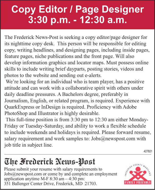 Copy Editor / Page Designer 3:30 p.m. - 12:30 a.m. The Frederick News-Post is seeking a copy editor/page designer for its nighttime copy desk. This person will be responsible for editing copy,... Read More |