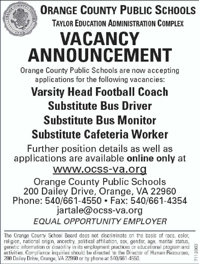 ORANGE COUNTY PUBLIC SCHOOLS TAYLOR EDUCATION ADMINISTRATION COMPLEX VACANCY ANNOUNCEMENT Orange County Public Schools are now accepting applications for the fallowing vacancies: Varsity Head... Read More |
