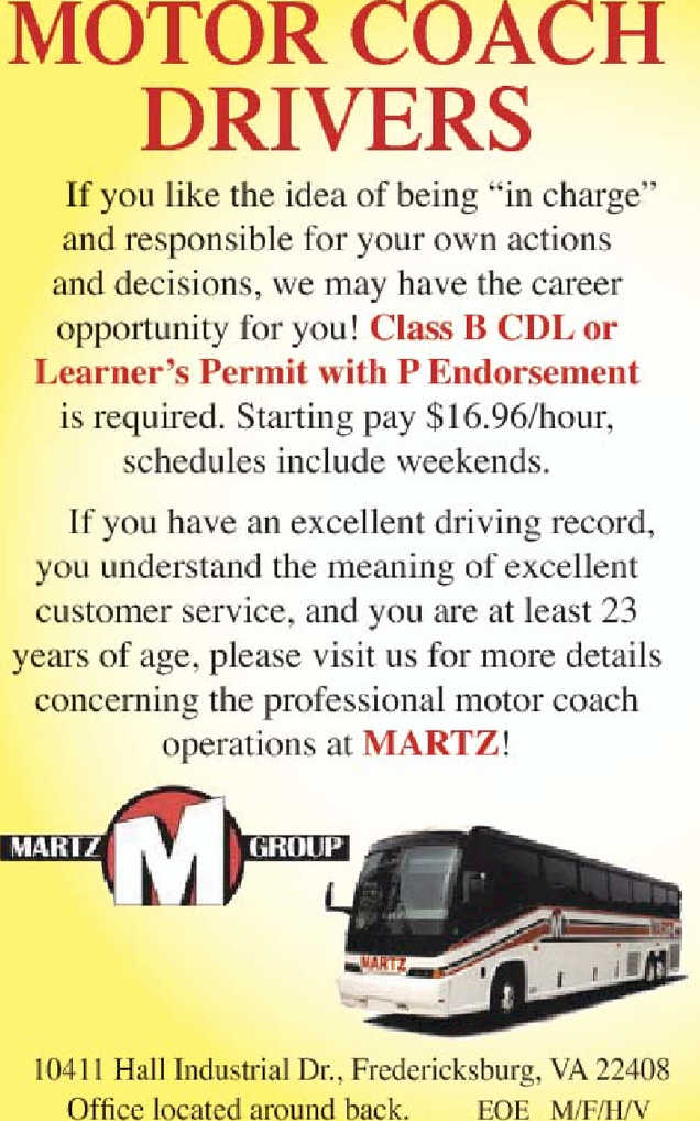 MOTOR COACH DRIVERS If you like the idea of being "in charge" and responsible for your own actions and decisions, we may have the career opportunity for you! Class B CDL or Learner's Permit with P... Read More |