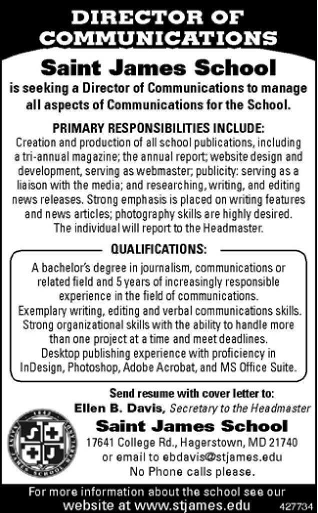 DIRECTOR OF COMMUNICATIONS Saint James School is seeking a Director of Communications to manage all aspects of Communications for the School. PRIMARY RESPONSIBLE INCLUDE: Creation and production of... Read More |