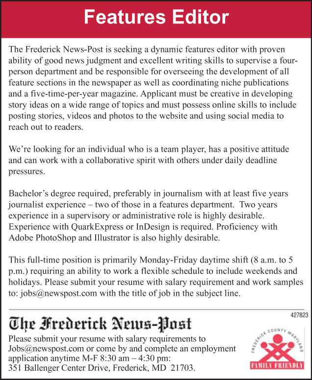 Features Editor The Frederick News-Post is seeking a dynamic features editor with proven ability of good news judgment and excellent writing skills to supervise a four person department and be... Read More |