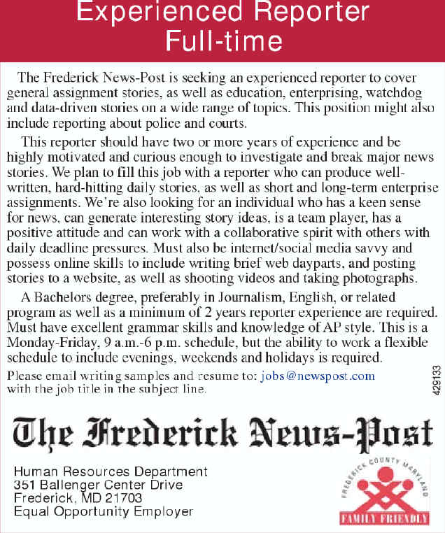 Experienced Reporter Full-time The Frederick News-Post is seeking an experienced reporter to cover general assignment stories, as well as education, enterprising, watchdog and data-driven stories on... Read More |