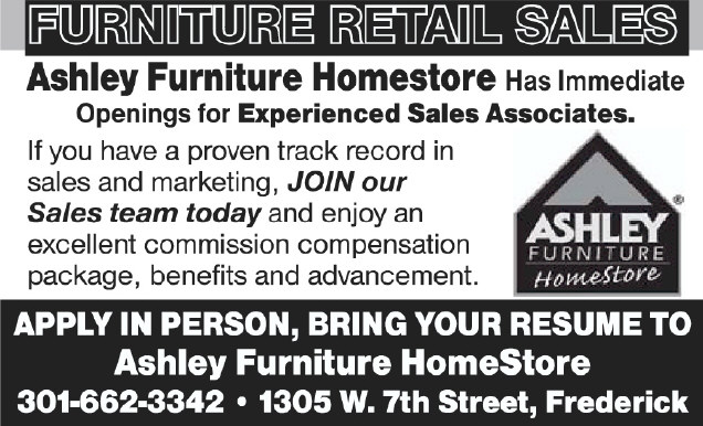 FURNITURE RETAIL SALES Ashley Furniture Homestore Has Immediate Openings for Experienced Sales Associates. If you have a proven track record in sales and marketing, JOIN our Sales team today and... Read More |
